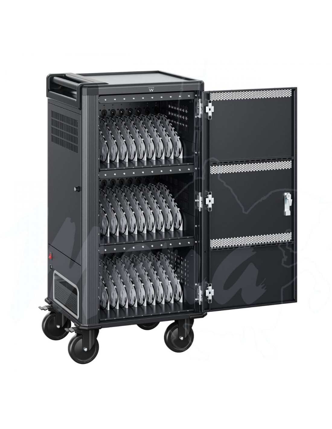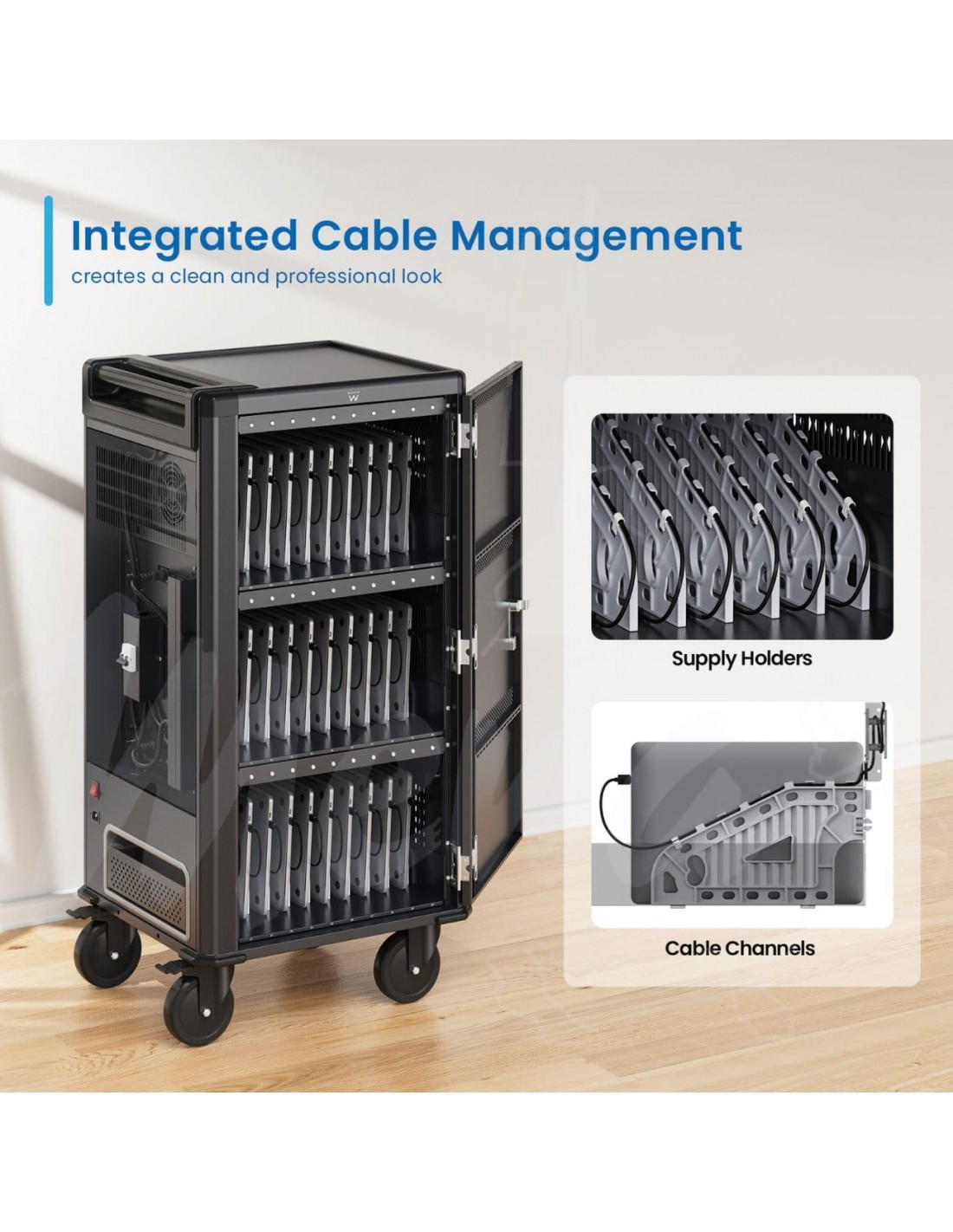 Cuenta con estantes numerados y divisores resistentes que optimizan el almacenamiento y la organización de dispositivos como portatiles, MacBooks, Chromebooks y Tablets.
