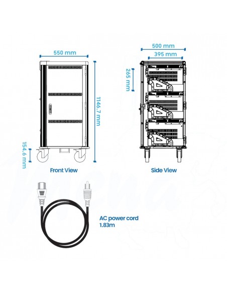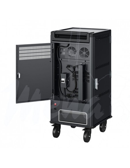 Completamente ensamblado y pre-cableado con conexiones USB-C, lo que facilita una implementación inmediata. Cuenta con estantes numerados y divisores resistentes que optimizan el almacenamiento y la organización de dispositivos como portatiles, MacBooks, Chromebooks y Tablets.