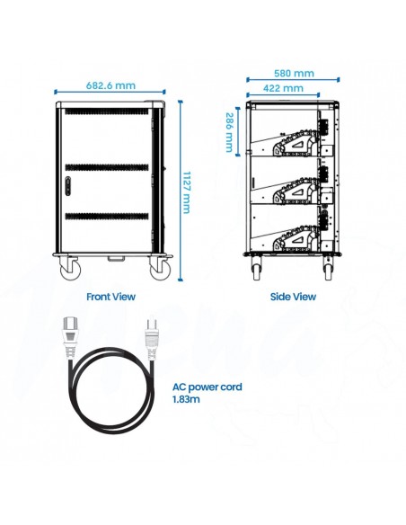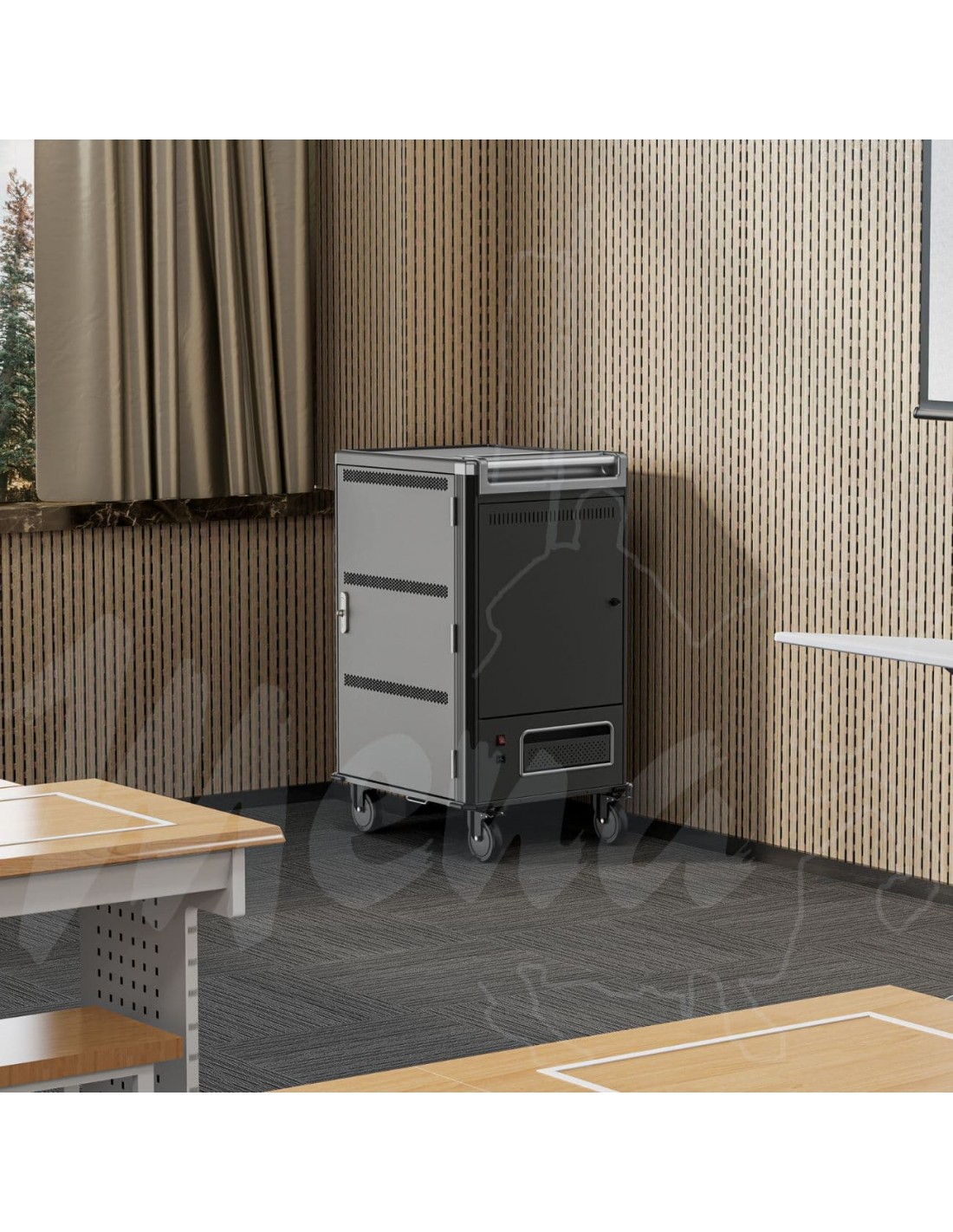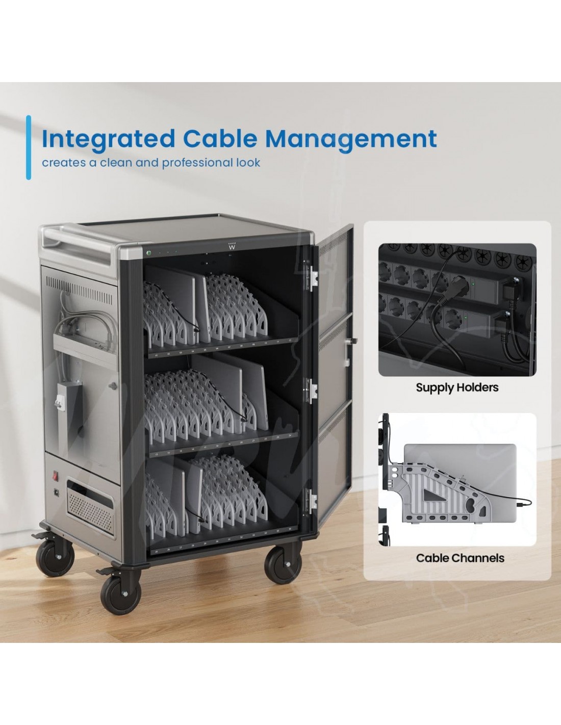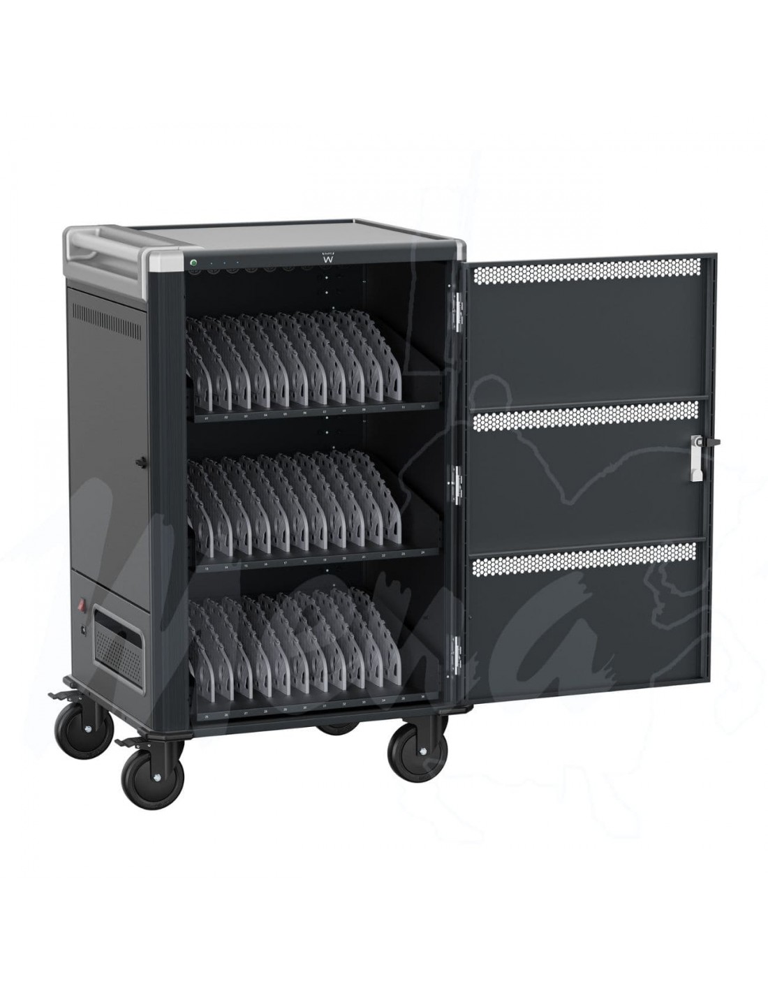 Carro cargador con estantes equipados con divisores duraderos y flexibles, que permiten almacenar y acceder fácilmente a todo tipo de dispositivos, incluyendo Chromobooks, portártiles y tablets.