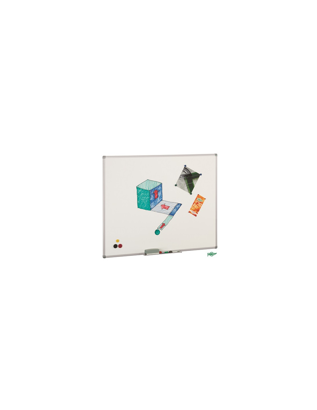 Pizarra blanca con marco de aluminio y cantoneras decorativas.