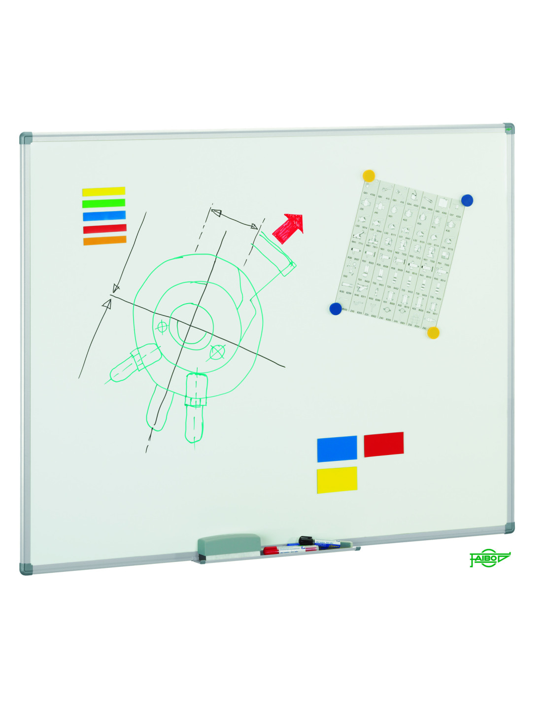 Pizarra blanca con marco de aluminio y cantoneras decorativas.