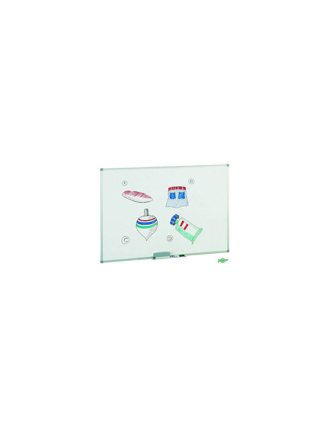 Pizarra blanca con marco de aluminio y cantoneras decorativas.