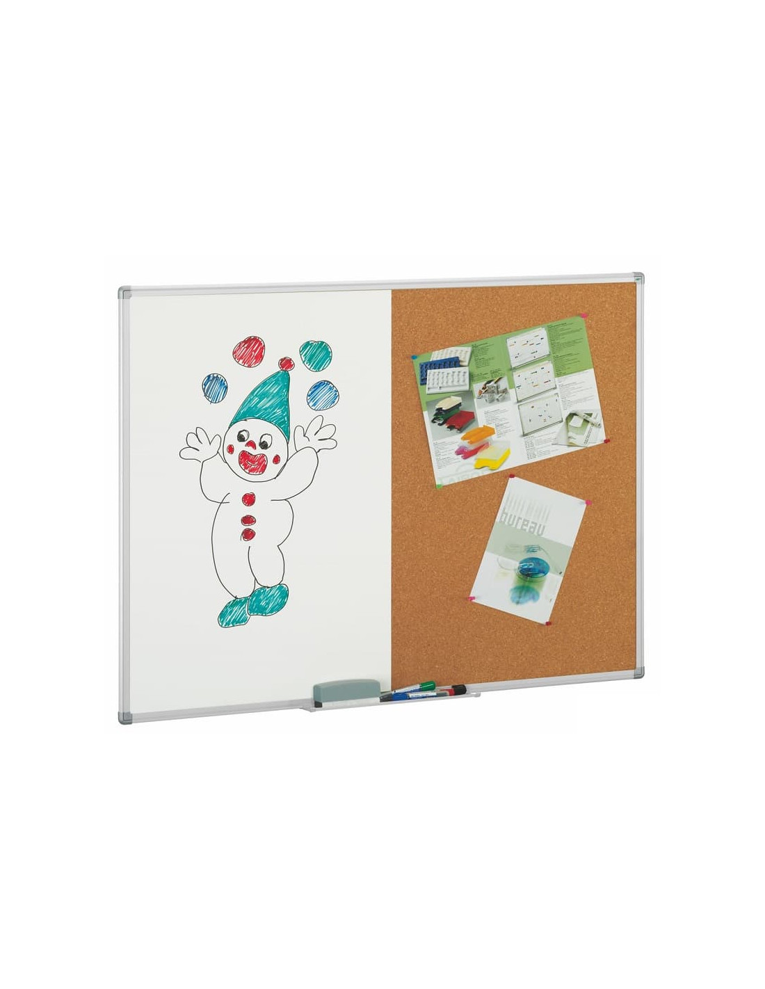 Pizarra doble uso con marco de aluminio y cantoneras decorativas. La mitad de la superficie es de corcho y la otra mitad pizarra blanca. Incluye cajetín y elementos de fijación. Medid 90 x 120 cm.