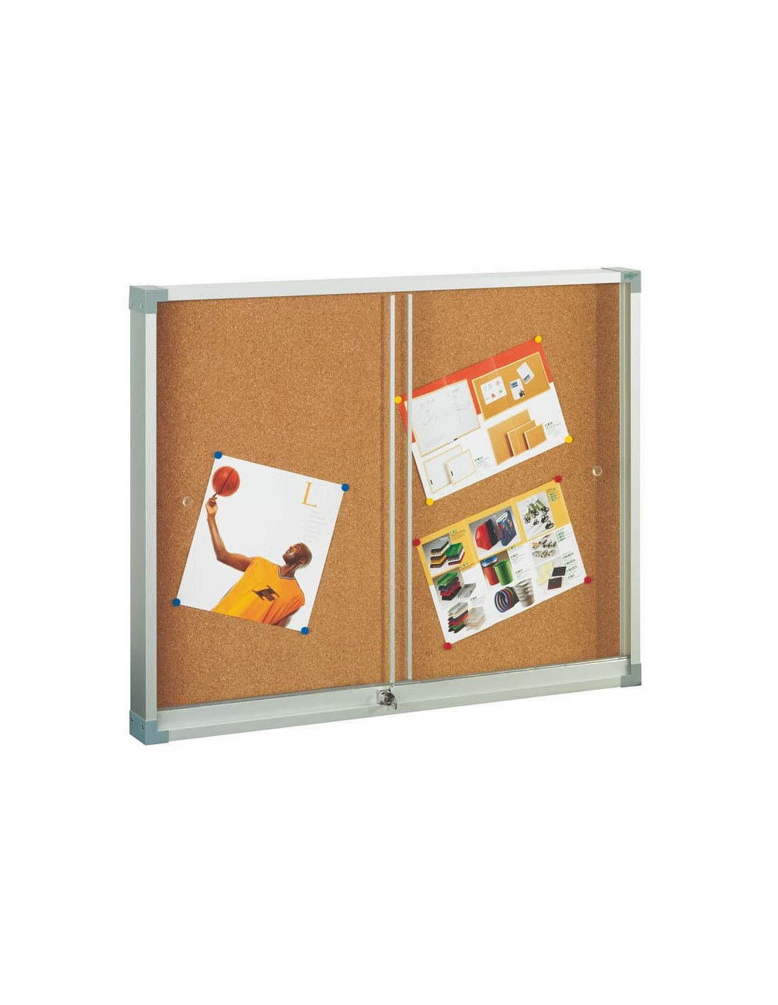 Vitrina con estructura de aluminio anodizado y cantoneras decorativas. Marco de aluminio, con puertas correderas mediante mecanismo deslizante de rodamientos. Incluye elementos de fijación. Cerradura con llave. Superficie de corcho de 5 mm. de espesor. y soporte de madera aglomerada. Medida 90 x 120 cm.