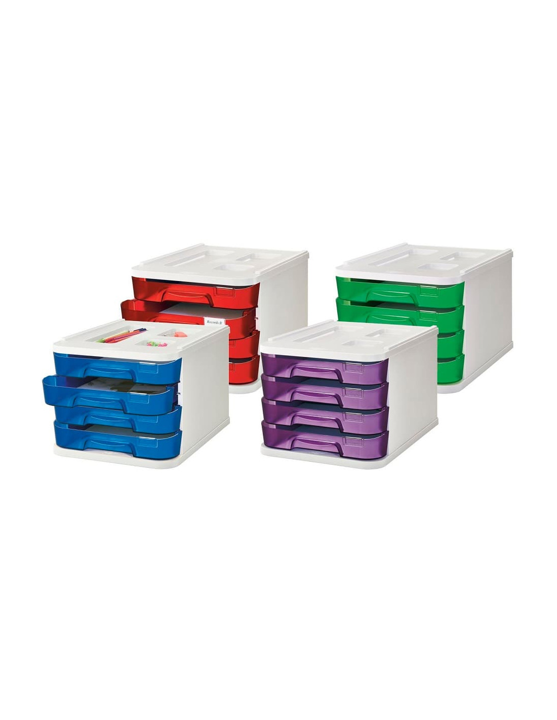 Módulo con 4 cajones de 5 cm. para guardar documentos. Sistema de bloqueo para evitar que salgan. Portaetiquetas para cada cajón. Se puede apilar de forma vertical. Tapas decorativas. Exterior gris y cajones en rojo Medida exterior 28 x 37 x 23 cm.