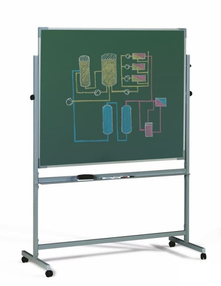 Pizarra con marco de alumino, de dos caras de trabajo. Estratificada blanca una superficie y verde la otra. Los soportes metálicos incluyen ruedas con freno y elementos de seguridad. Incluye cajetín. Medida 122 x 150 cm.