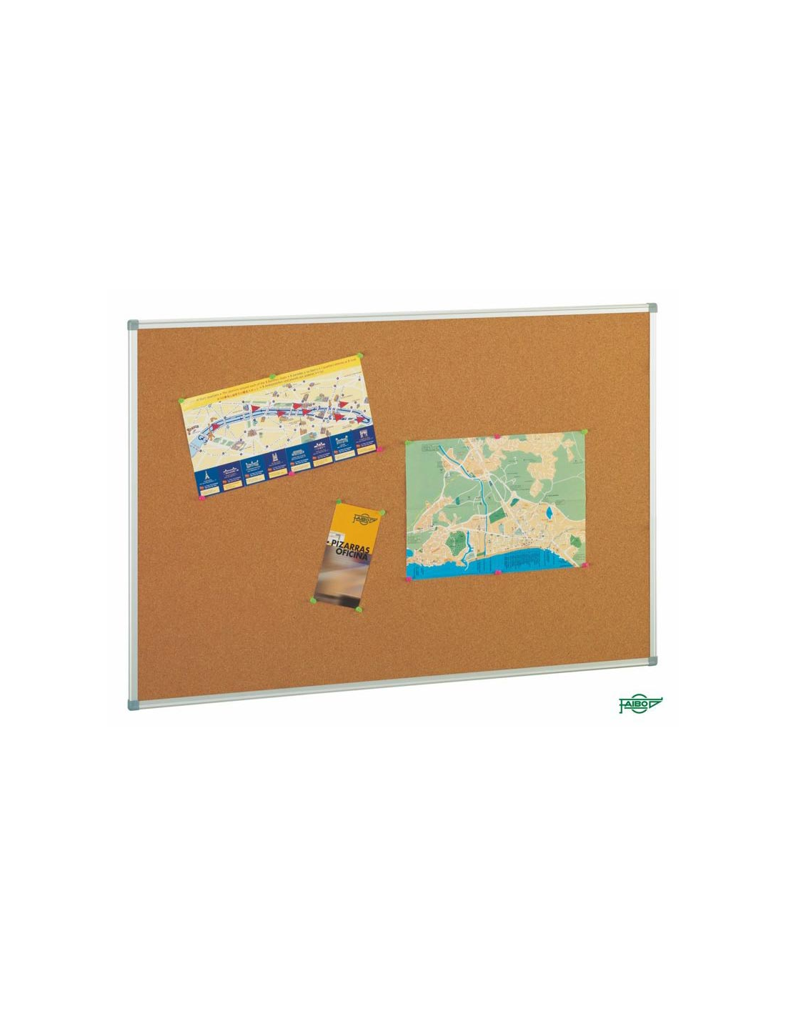 Tablero de corcho con marco de aluminio y cantoneras decorativas. Corcho de 1 mm. de espesor sobre soporte de fibra. Incluye elementos de fijación en la pared. Medida 90 x 120 cm.
