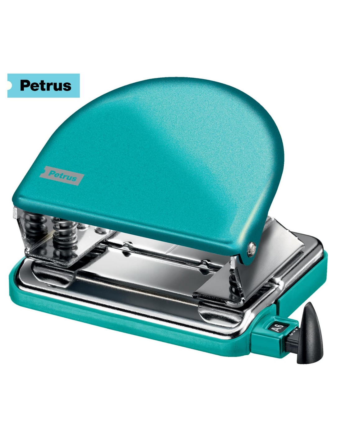 Perforadora de metal con acabado de plástico de color. Perfora hasta 20 hojas de papel de 80 g. FORMATO de perforado en A4; A5; A6; Folio; US-Quart y 8 x 8 COLOR turquesa