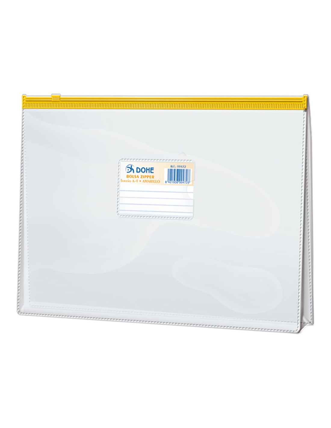 Bolsa Zipper fabricada en PVC transparente expandible. Cierre zip hermético con apertura superior. Tamaño Folio apaisado Color amarillo Pack 24 uds.