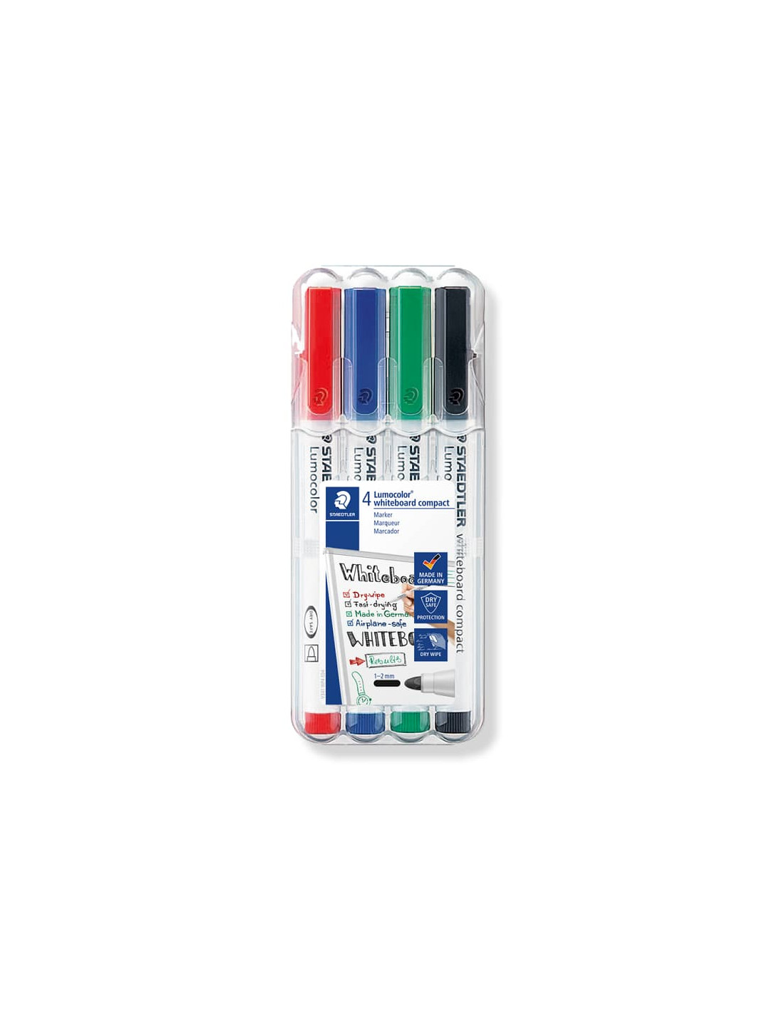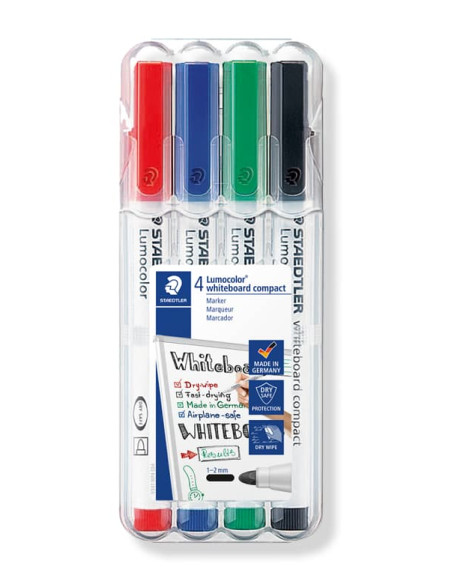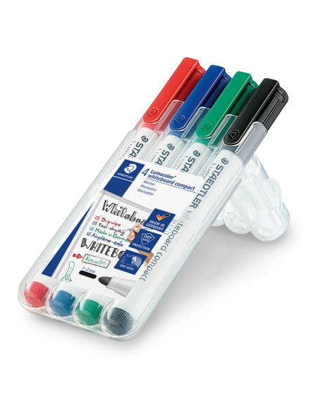 Estuche de plástico con 4 rotuladores para pizarra blanca STAEDTLER LUMOCOLOR WHITEBOARD 341 colores surtidos. Borrables en seco en pizarras blancas y en superficies esmaltadas como porcelana y vidrio. Tinta base alcohol, sin olor. Libre de xileno y tolueno. Punta redonda 1.0 - 2.0 mm aprox. AIRPLANE SAFE: Equilibrio automático de la presión para evitar pérdidas durante un vuelo. Recargable con cargador WHITEBOARD MARKER 488 51.