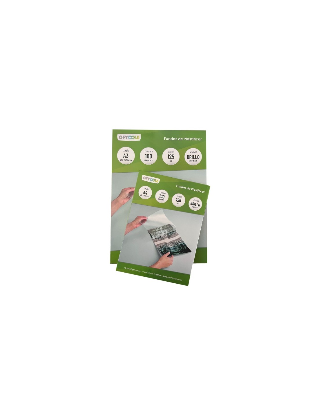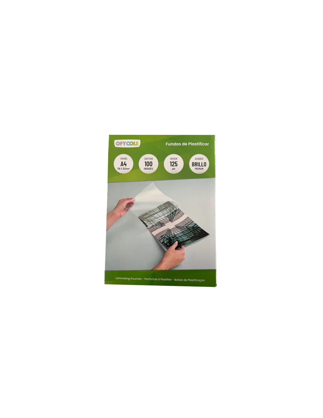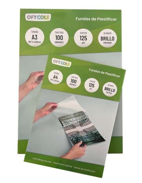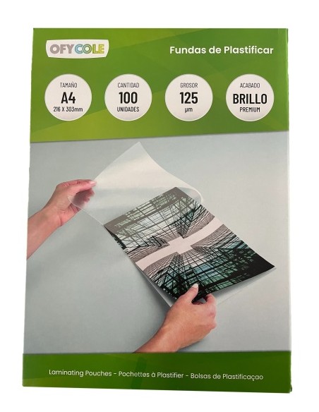 Caja cartón con 100 bolsas de plastificación, resistentes al agua.