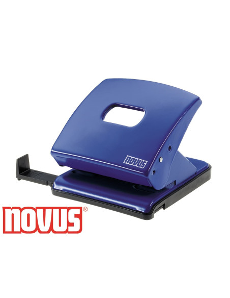 Perforadora de papel mediana con indicador de tamaño de papel. Fabricada en metal y recubierto en plástico de color brillante. Base antideslizante. Perfora hasta 16 hojas de papel 80 gm Color azul