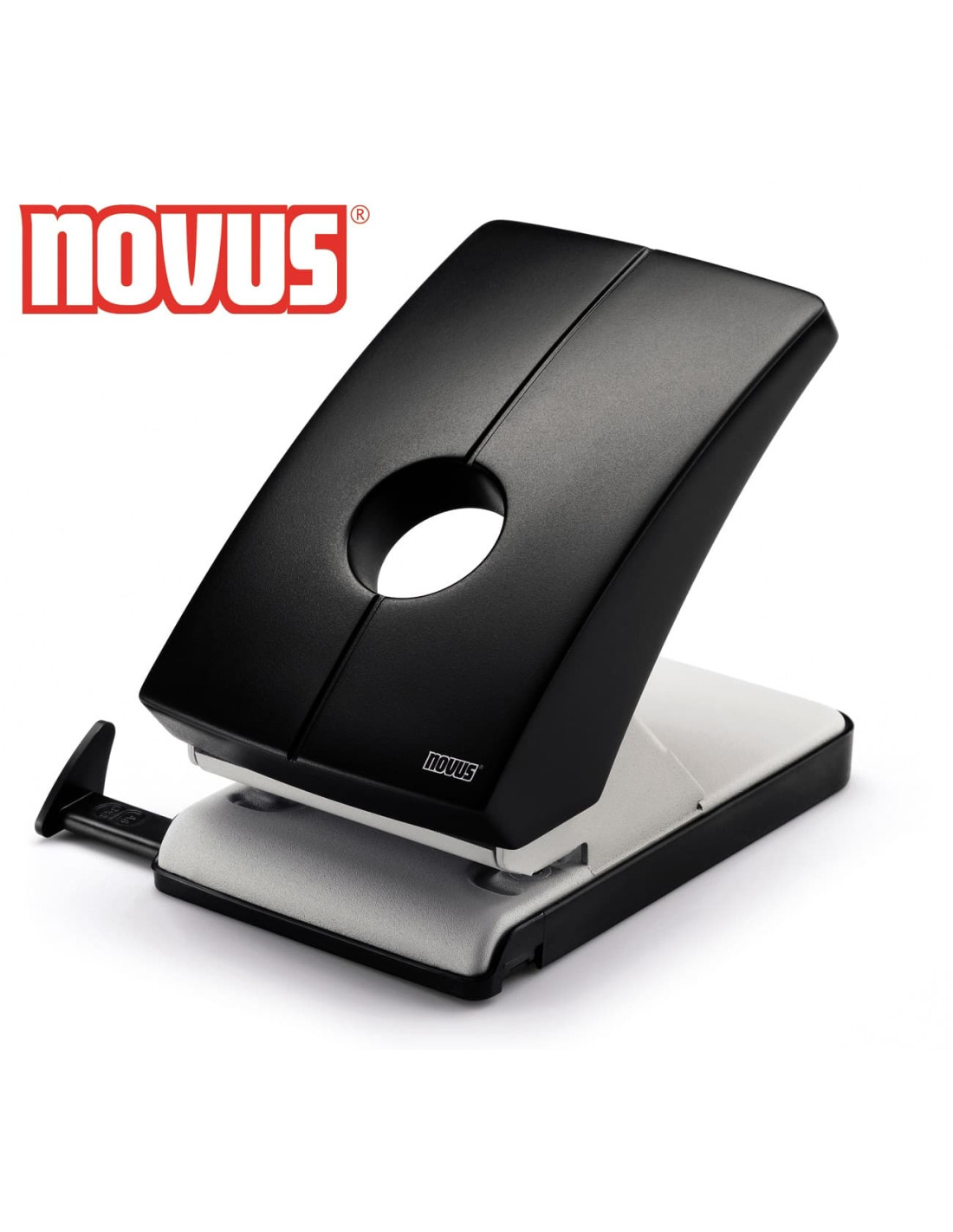 Perforadora de papel con indicador de tamaño de papel. Fabricada en metal y recubierto en plástico de color brillante. Mecanismo de bloqueo de tapa cerrada. Base antideslizante. Perfora hasta 40 hojas de papel 80 gm Color negro