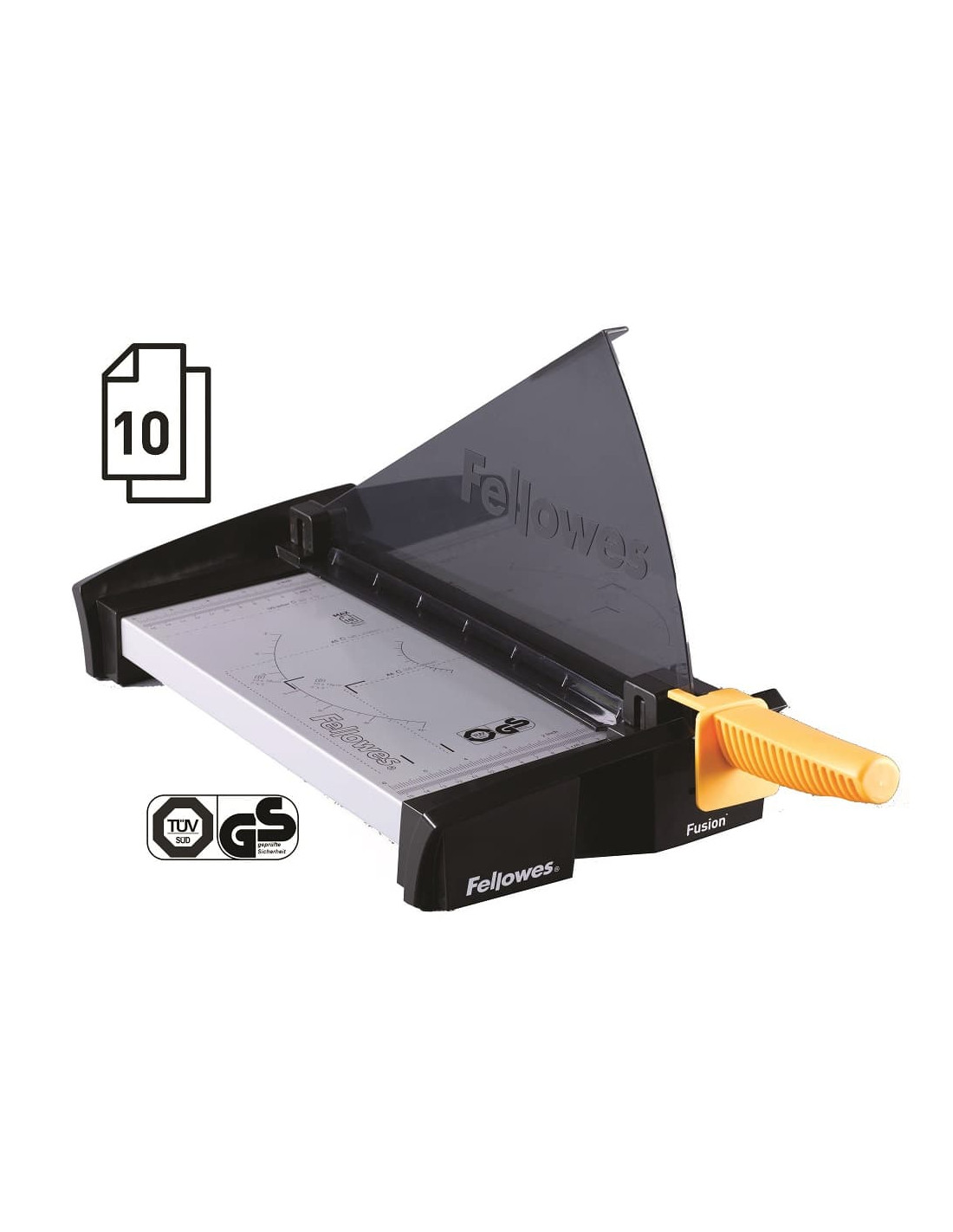 Guillotina de palanca de cuchilla de acero encapsulada para mayor seguridad.