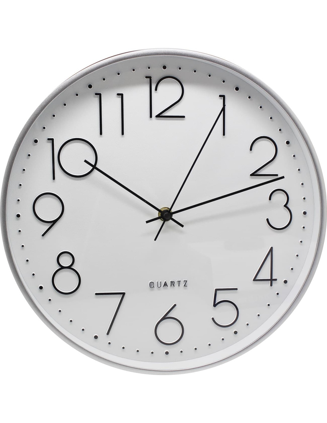 Reloj analógico de pared con marco de plástico y lente de cristal. Marco en color plata de 30 cm .