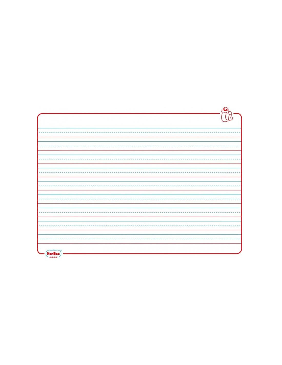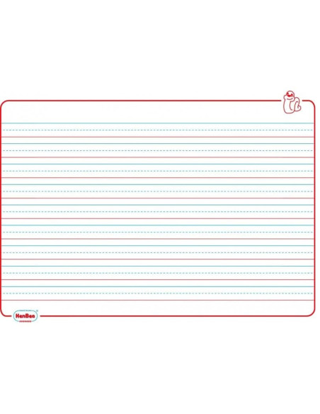 La superficie es brillante con líneas pautadas en rojo y azul.