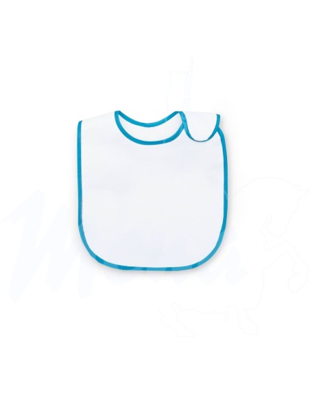 Babero de algodón por la parte delantera y de plástico para la parte posterior evitando el traspaso de líquidos. Cierre lateral de velcro. Medida 25x40 cm.
