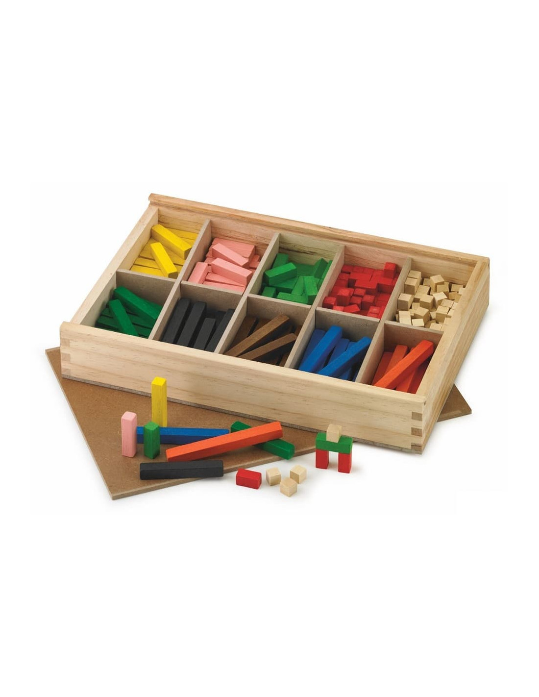 Caja de regletas de madera con departamentos. 300 piezas. Contiene folleto con instrucciones.