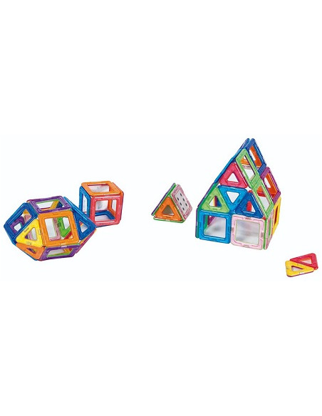 Experimenta la creación de figuras geométricas con triángulos y cuadrados, gracias a la fuerza magnética. Contiene 60 piezas