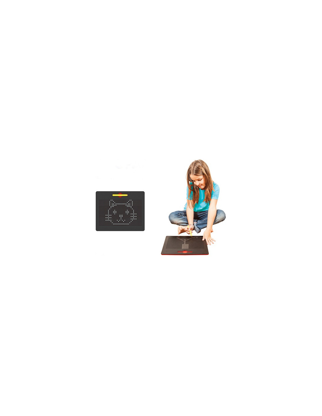 Soporte perforado con bolitas metálicas en su interior. Con la punta magnética extrae parcialmente las bolitas metálicas y crea dibujos, números o grecas. Contiene 10 tarjetas con 20 modelos diferentes. Especialmente indicado para trabajar la motricidad fina Medida 315 x 255 x 15 mm.
