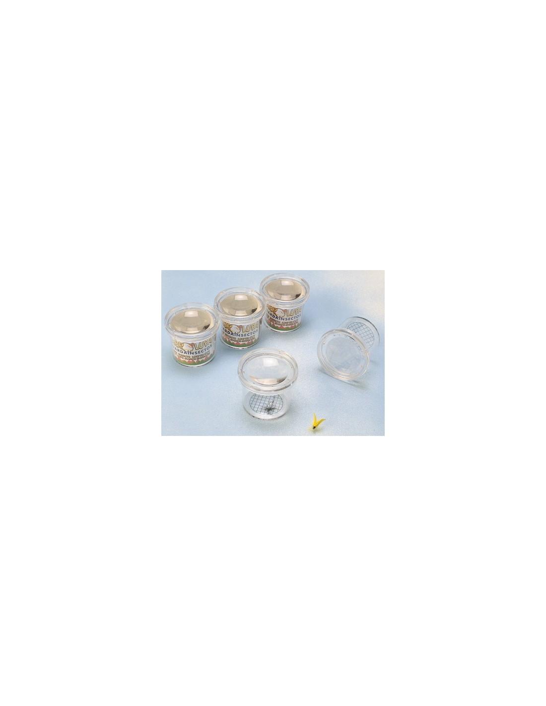 Juego de 6 tarros lupa para observar con detalles insectos o pequeños objetos. Base con cuadrícula.