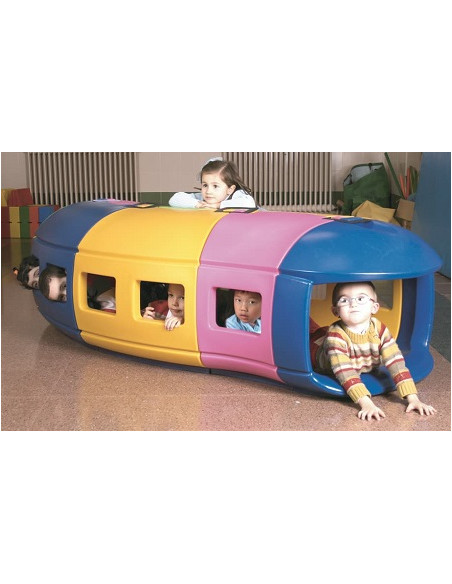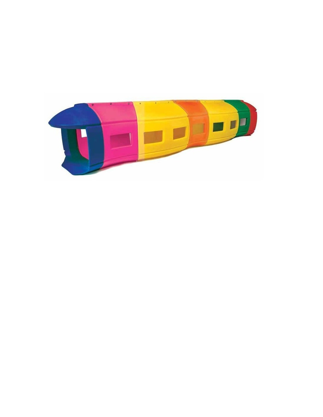 Túnel tren de reptación, fabricado en plástico rígido. Contiene cabeza, 3 vagones y cola. Medida 240 x 84 x 64 cm.