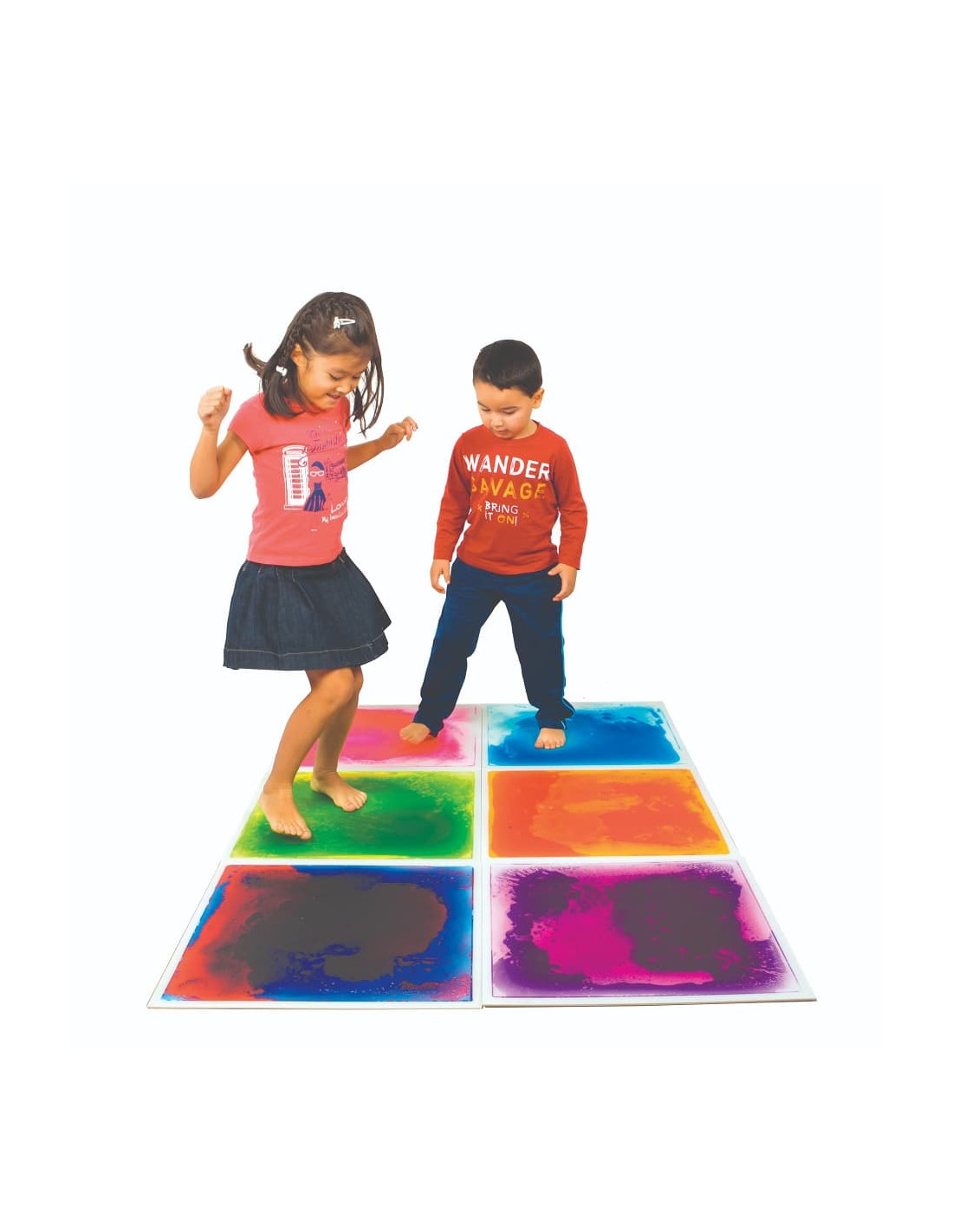 Suelo de baldosas rellenas de líquido sensorial que al pisarlas cambian de color, produciendo al pisarlas un agradable sensación. Estimulan el desarrollo sensorial y perceptual. Base antideslizante. Medida 30 x 30 cm. Pack de 6 baldosas en colores diferentes.