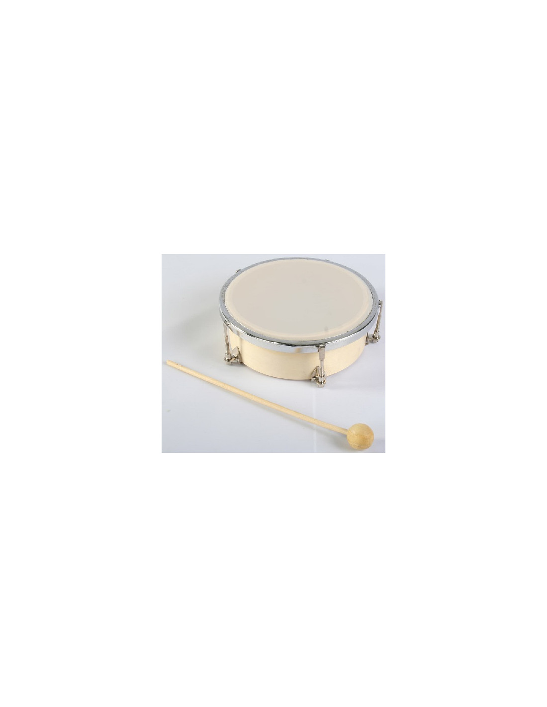 Tambor pandereta con baqueta y 4 pares de platillos metálicos.