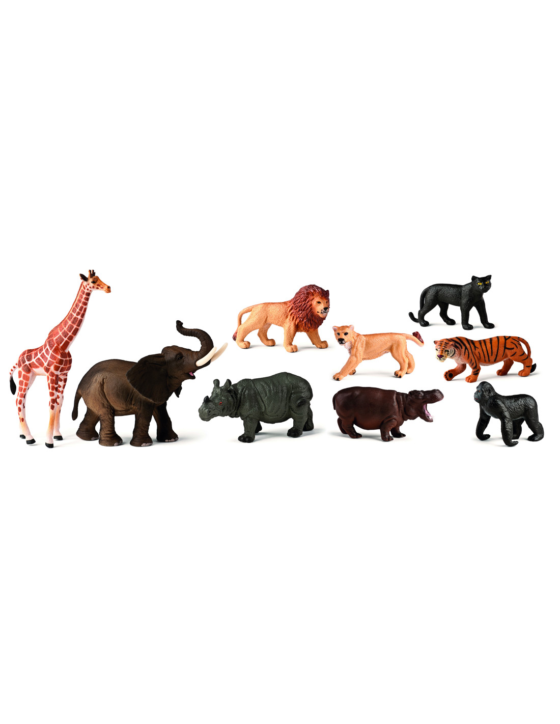 . Pantera, león, jirafa, tigre, elefante, gorila, leona, hipopótamo y rinoceronte.