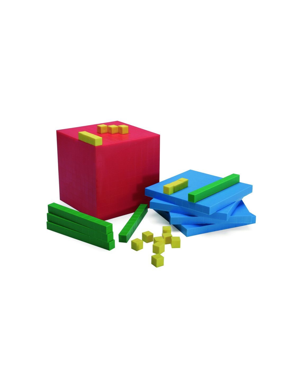 Bloques de base 10 en 4 colores diferentes.