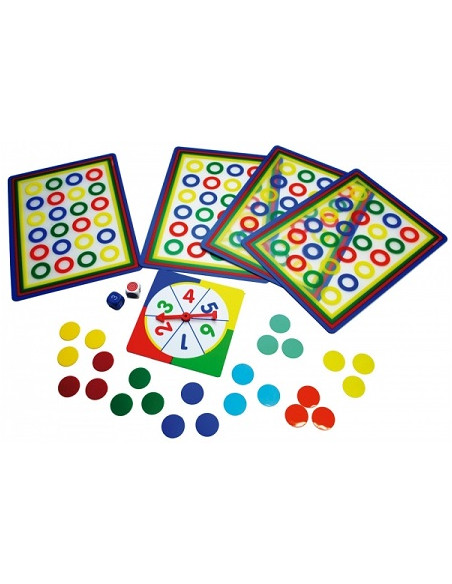 Contiene 4 tableros, 2 dados, 100 cuentas de colores y una ruleta.