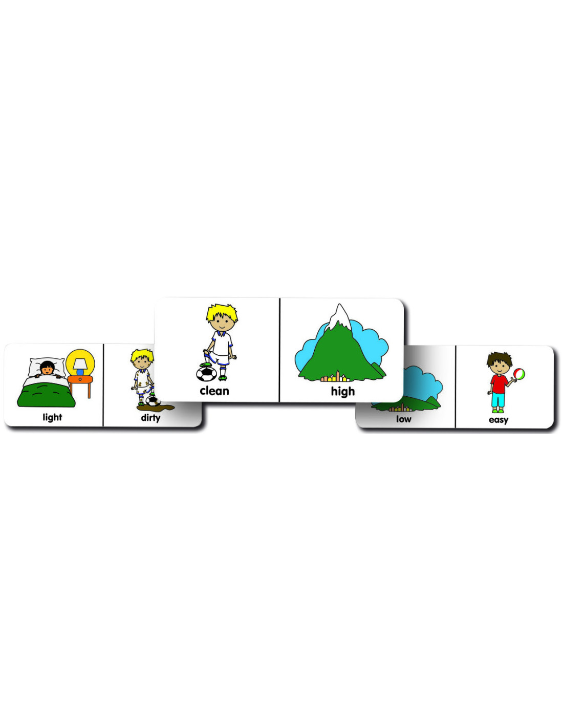 Juego de dominó para practicar la lectoescritura, relacionando cada adjetivo con su opuesto.