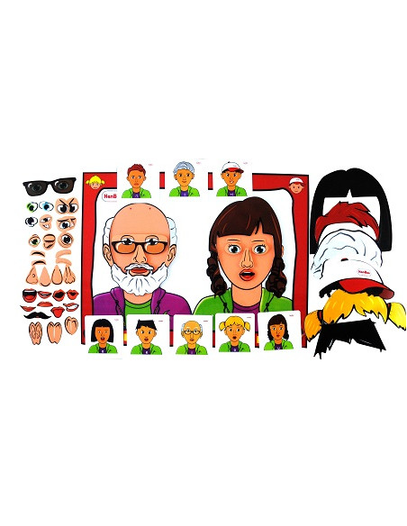 Contiene 8 tarjetas con ejemplos de composición y más de 50 piezas que incluyen ojos, bocas, pelo…