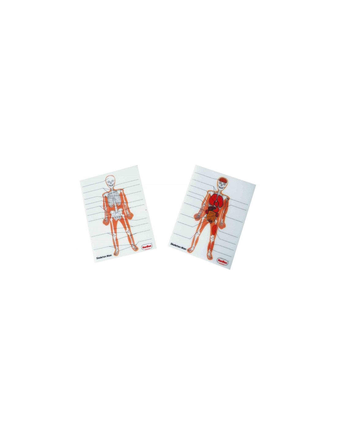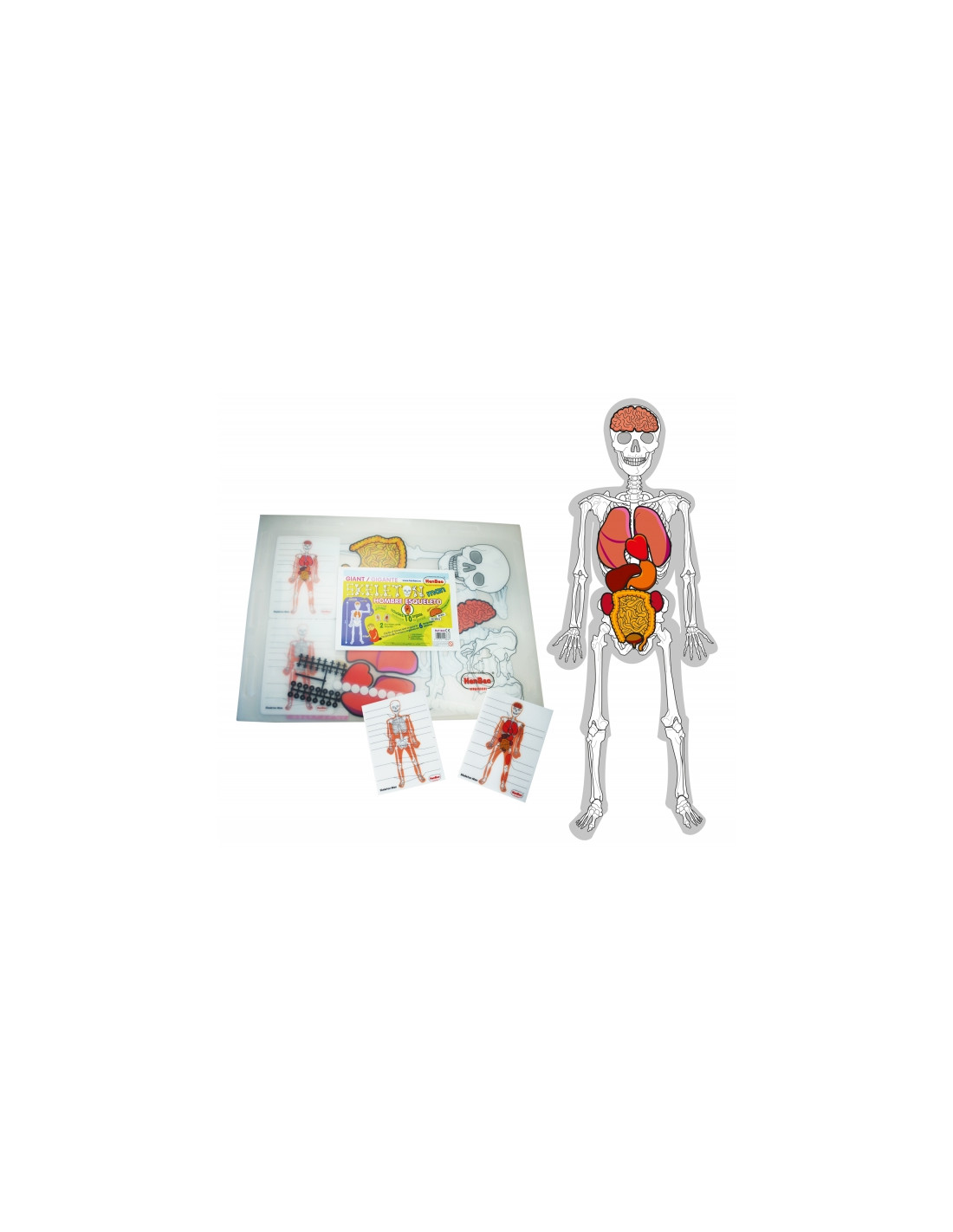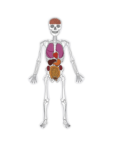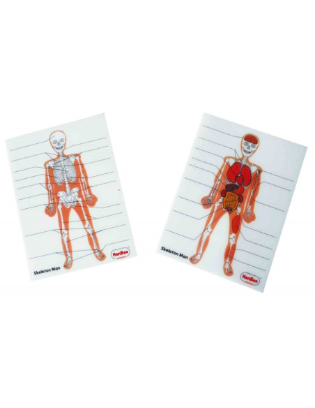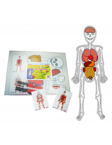Contiene un esqueleto, 10 organos plastificados, 2 tarjetas para escribir y un rotulador de limpieza en seco.