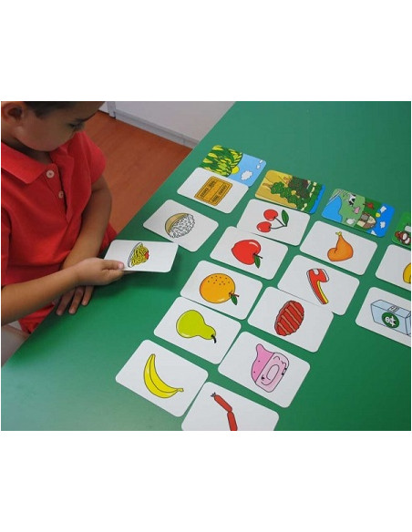 Juego educativo para enseñar al niño a que asocie las imágenes de las fichas con el origen del alimento.