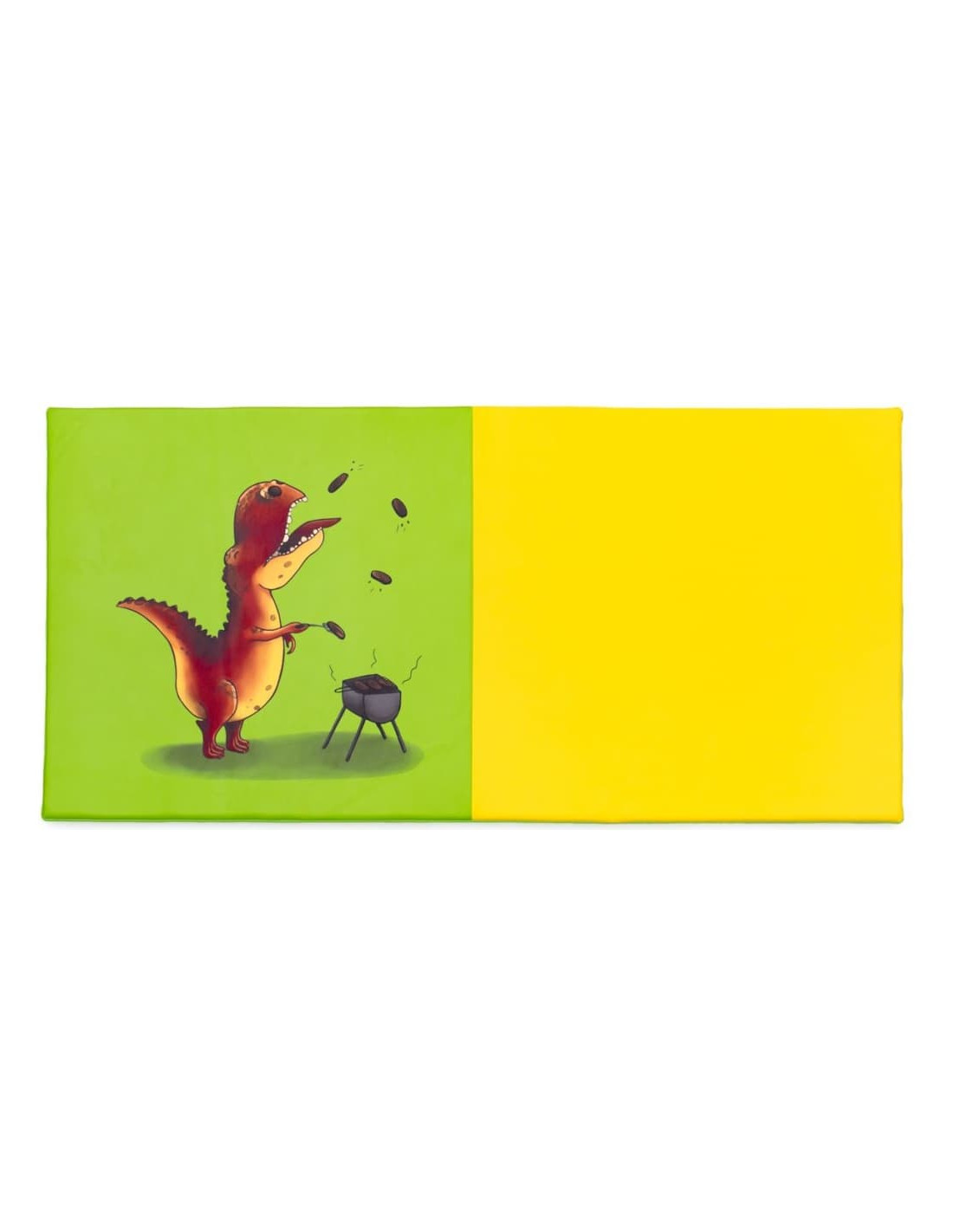 Tapete bicolor con estampado de un dinosaurio comiendo.