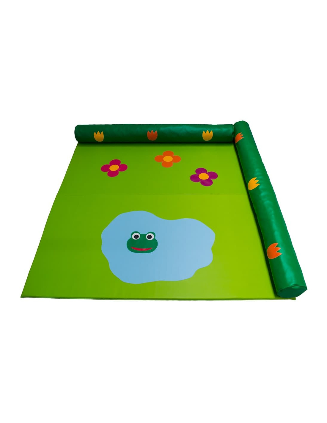 Alfombra cuadrado con flores estampadas y bordes de espuma en dos laterales.