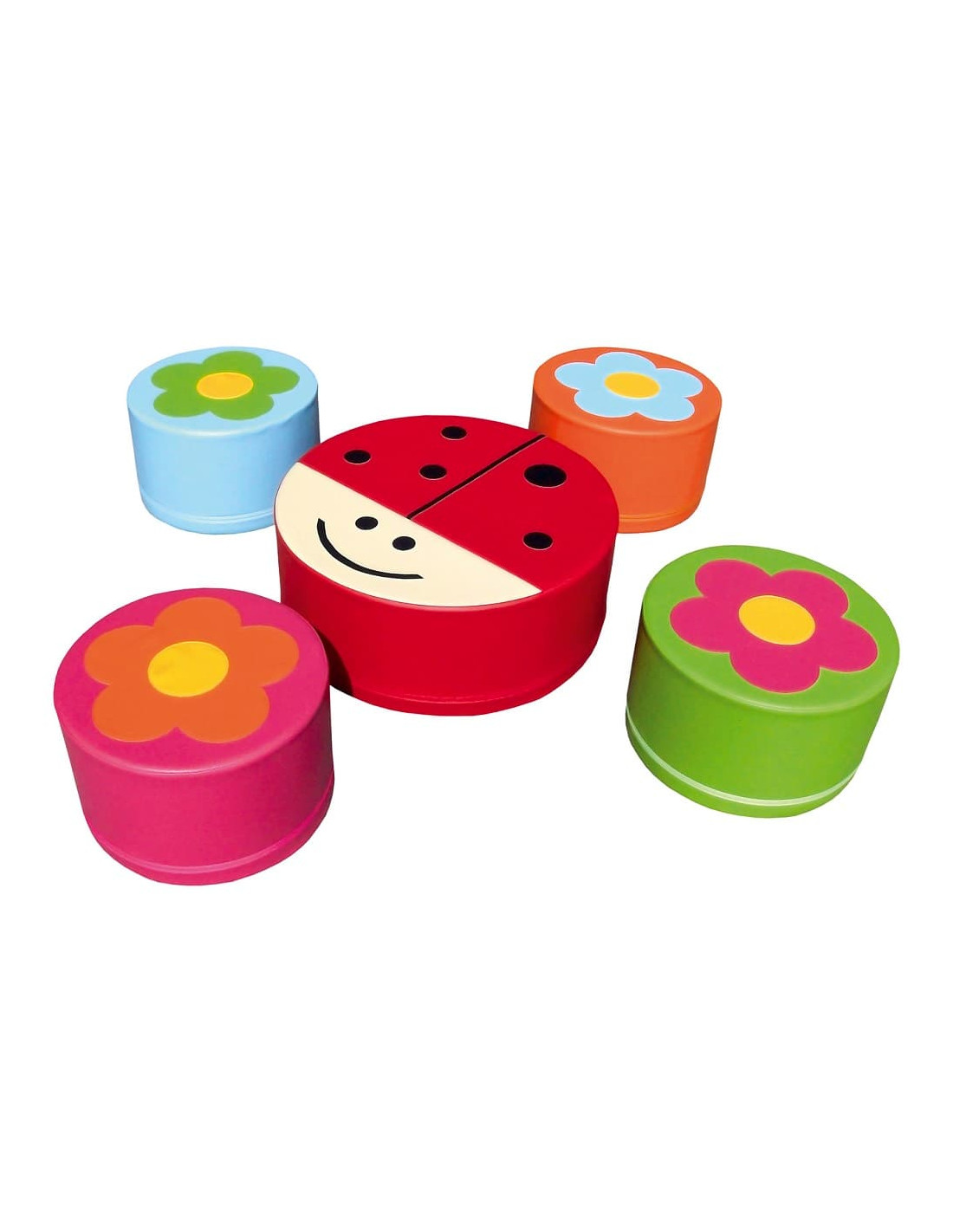 Juego de mesa redonda con mariquita y 4 taburetes con flores estampadas. Fabricado en espuma de poliuretano de 23 kgm, recubierto con tejido impermeable lavable. Cosido con hilo de alta resistencia. Puede ser fabricado con las combinaciones de colores que necesite, dentro de la gama de colores disponible. Mesa 60 x 25 cm. Taburete 40 x 25 cm.