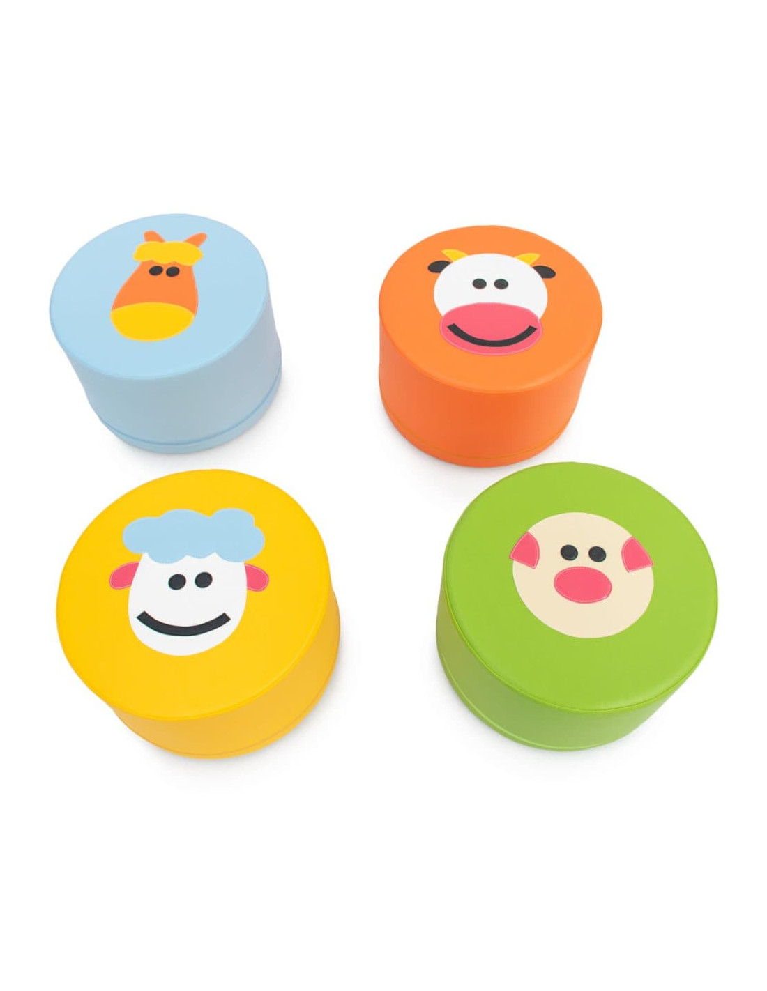 Set de 4 taburetes de foam redondos con animales de la granja estampados.