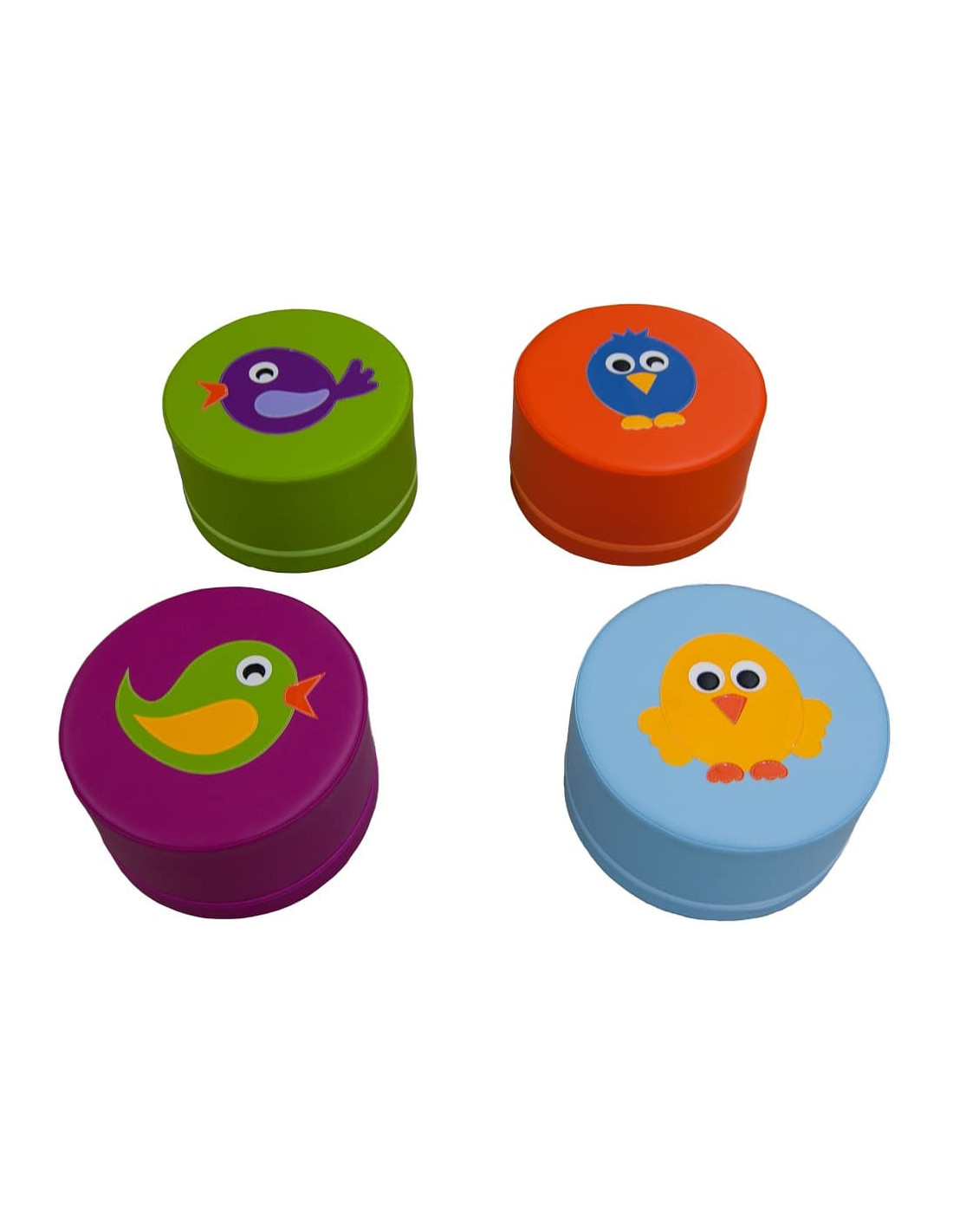 Set de 4 taburetes de foam redondos con estampado de pájaros.