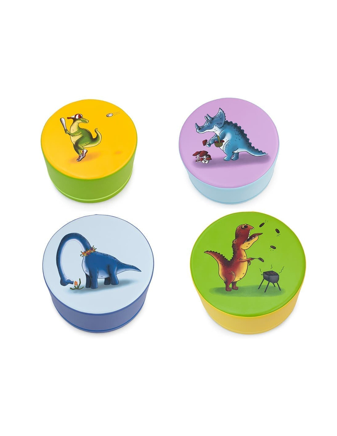 Set de 4 taburetes de foam redondos con dinosaurios estampados.