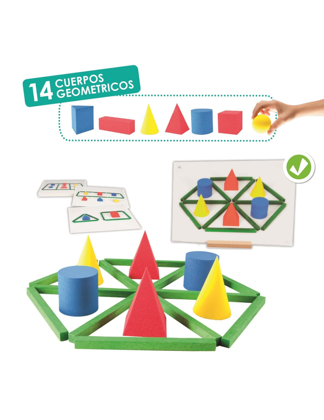 Incluye 15 regletas de madera, 14 figuras geométricas de foam,