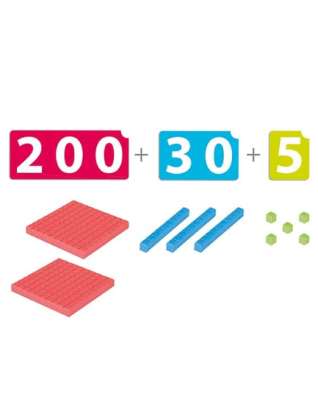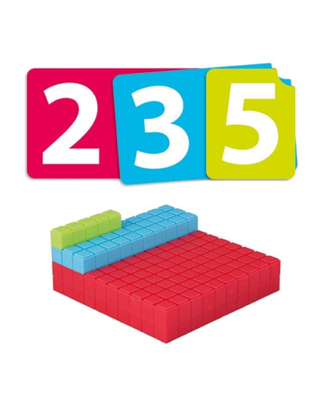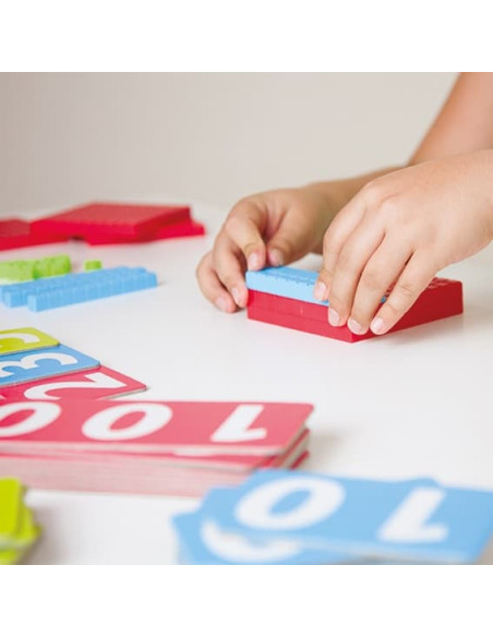 Las fichas se dividen en 7 fichas de signos, 9 fichas de decenas, 9 fichas de centenas y 20 fichas de unidades.
