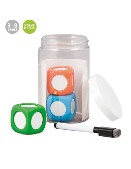 Incluye 3 maxi dados de colores y 1 rotulador borrable.