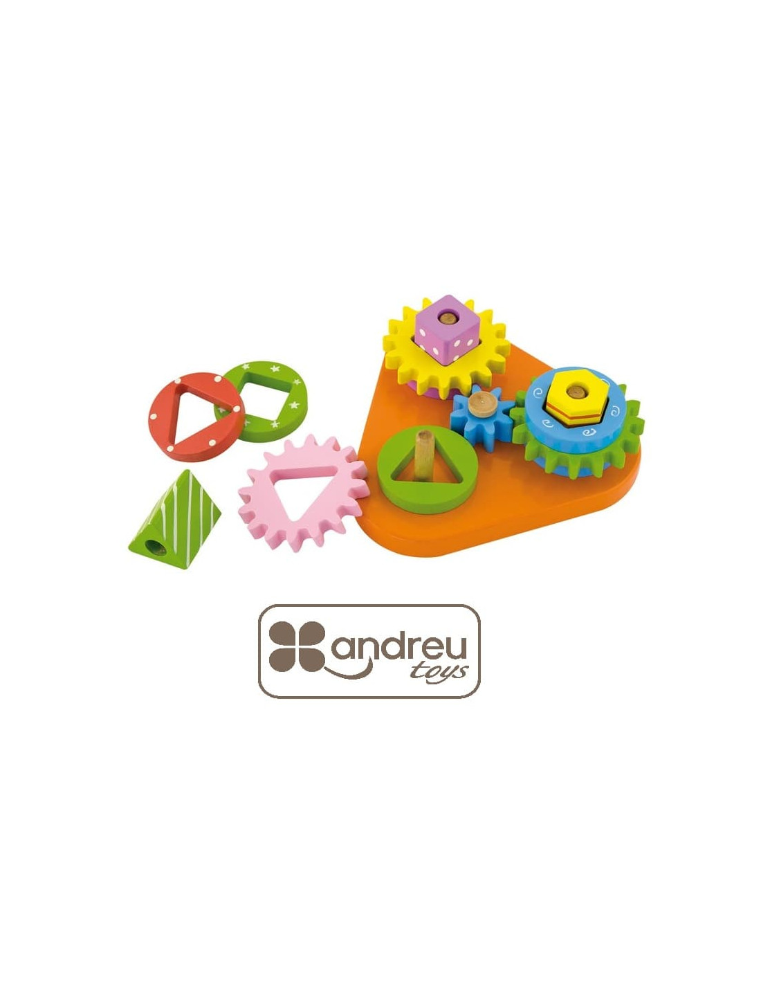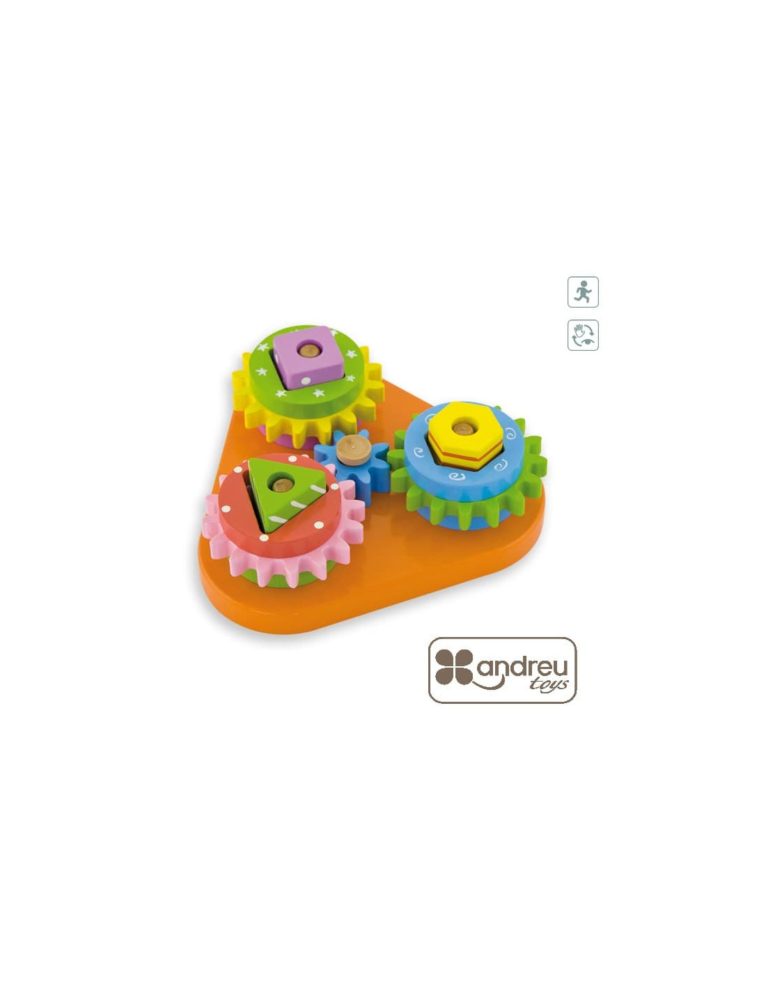 Juego de engranajes intercambiables con formas geométricas. Contiene 4 engranaje de distintos colores para personalizar con diferentes piezas. Trabaja la coordinación mano-ojo y las habilidades motoras. Medida 155 x 145 x 55 mm. Edad recomendada +18 meses.