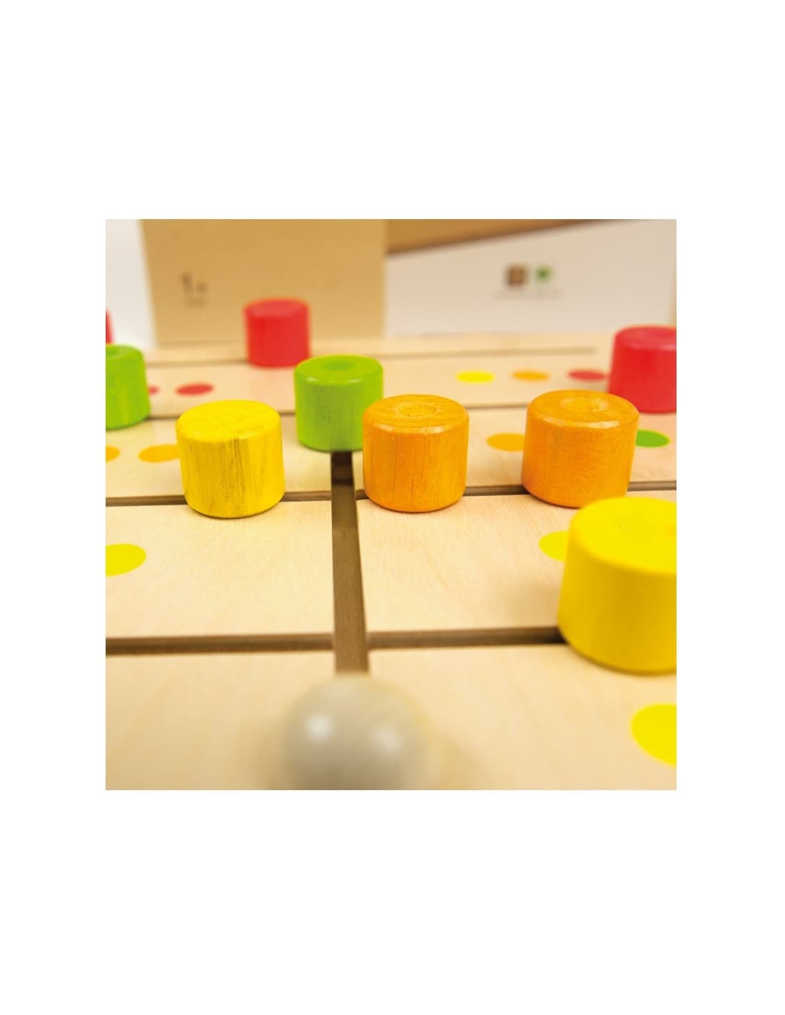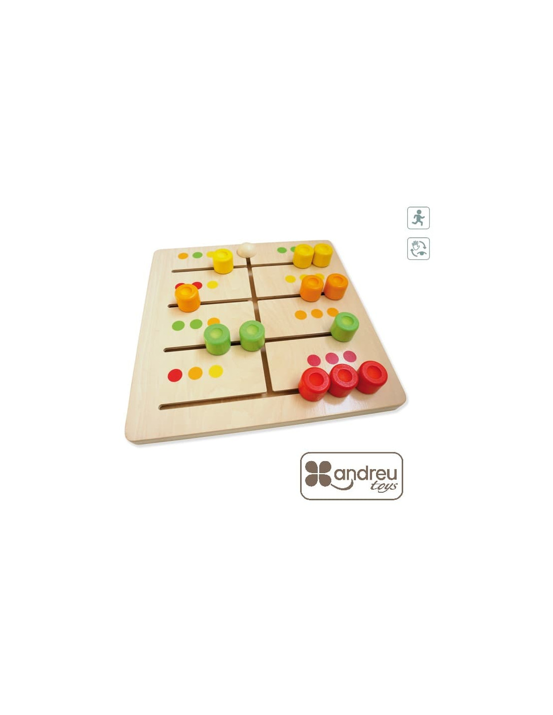 Juego de asociación deslizando los pivotes por el tablero de madera, y conseguir colocarlos como el ejemplo. Trabaja el razonamiento lógico y las habilidades motoras. Medida 300 x 300 x 45 mm. Edad recomendada +1 año.
