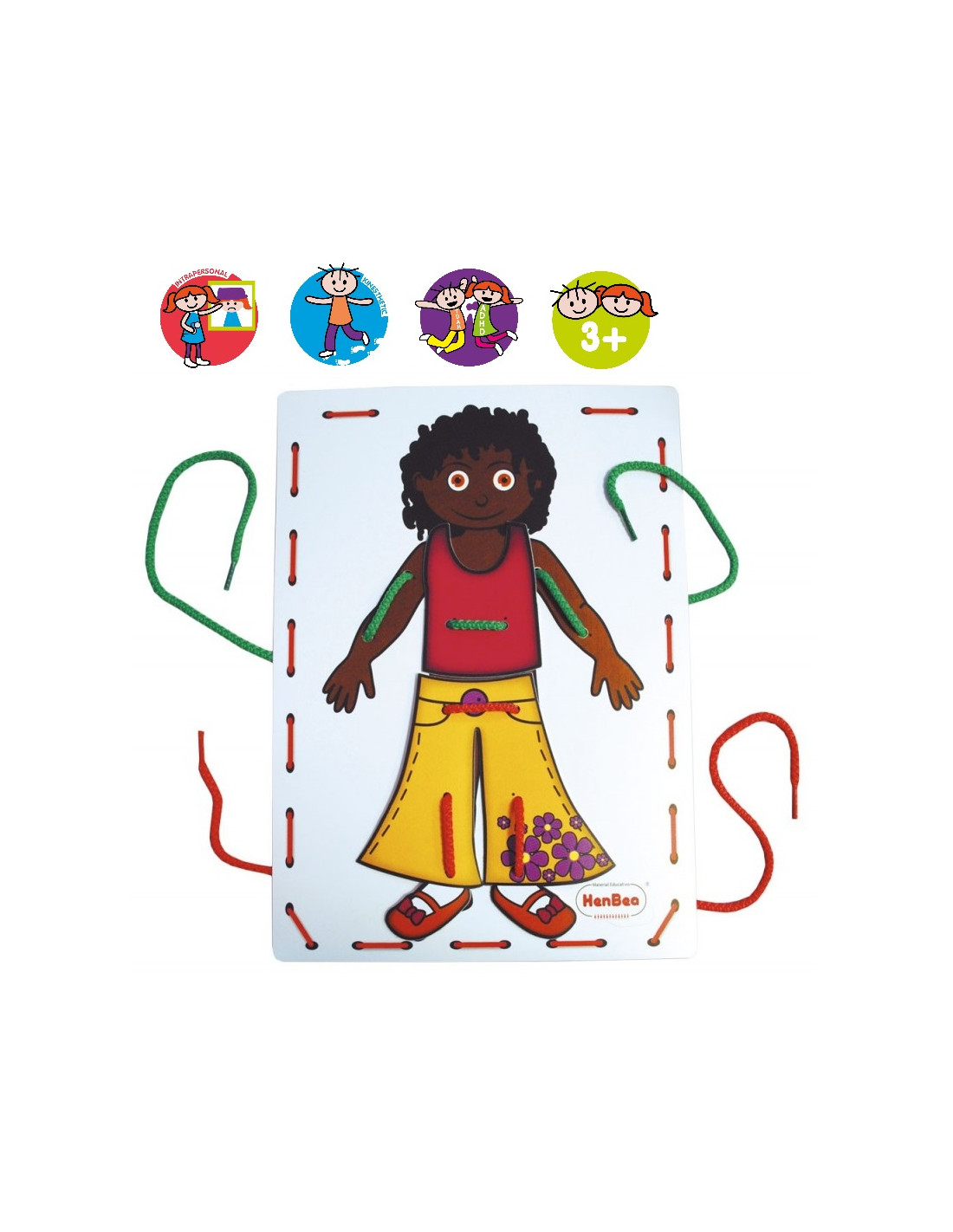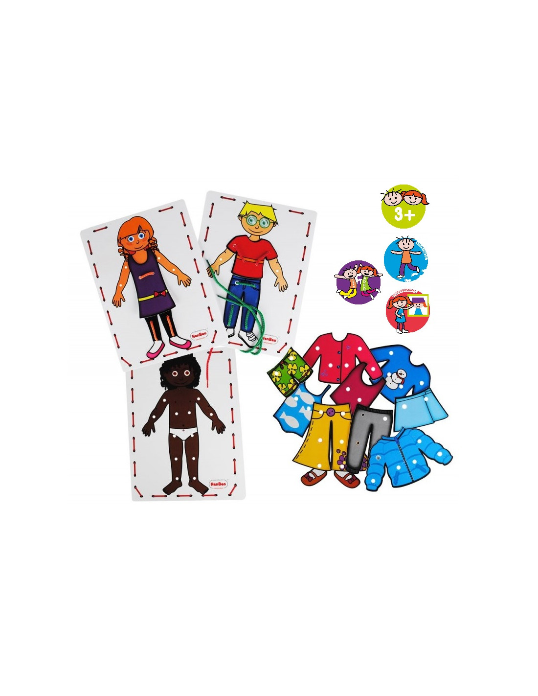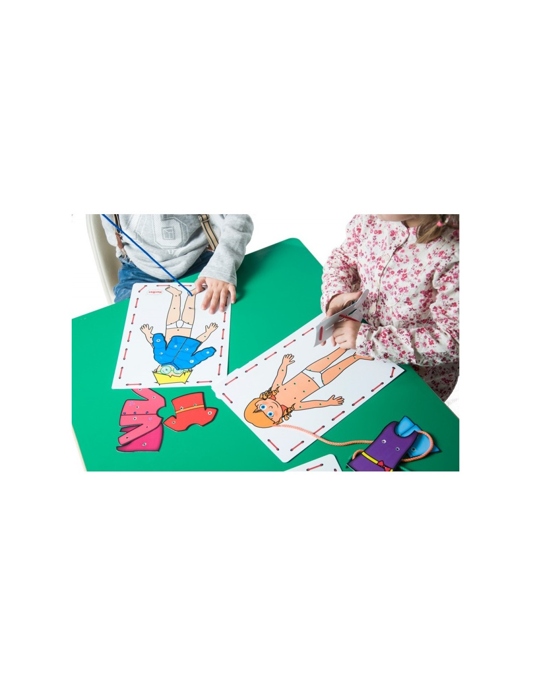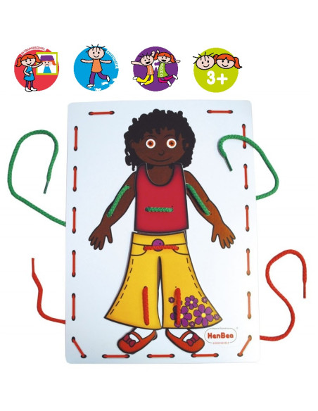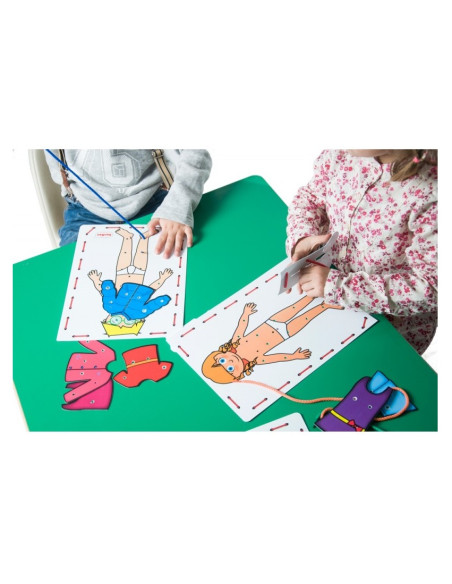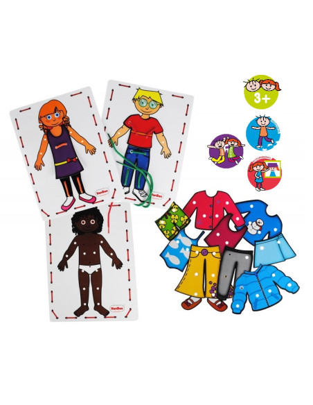 Incluye 3 tarjetas, 10 prendas de ropa y cordón.