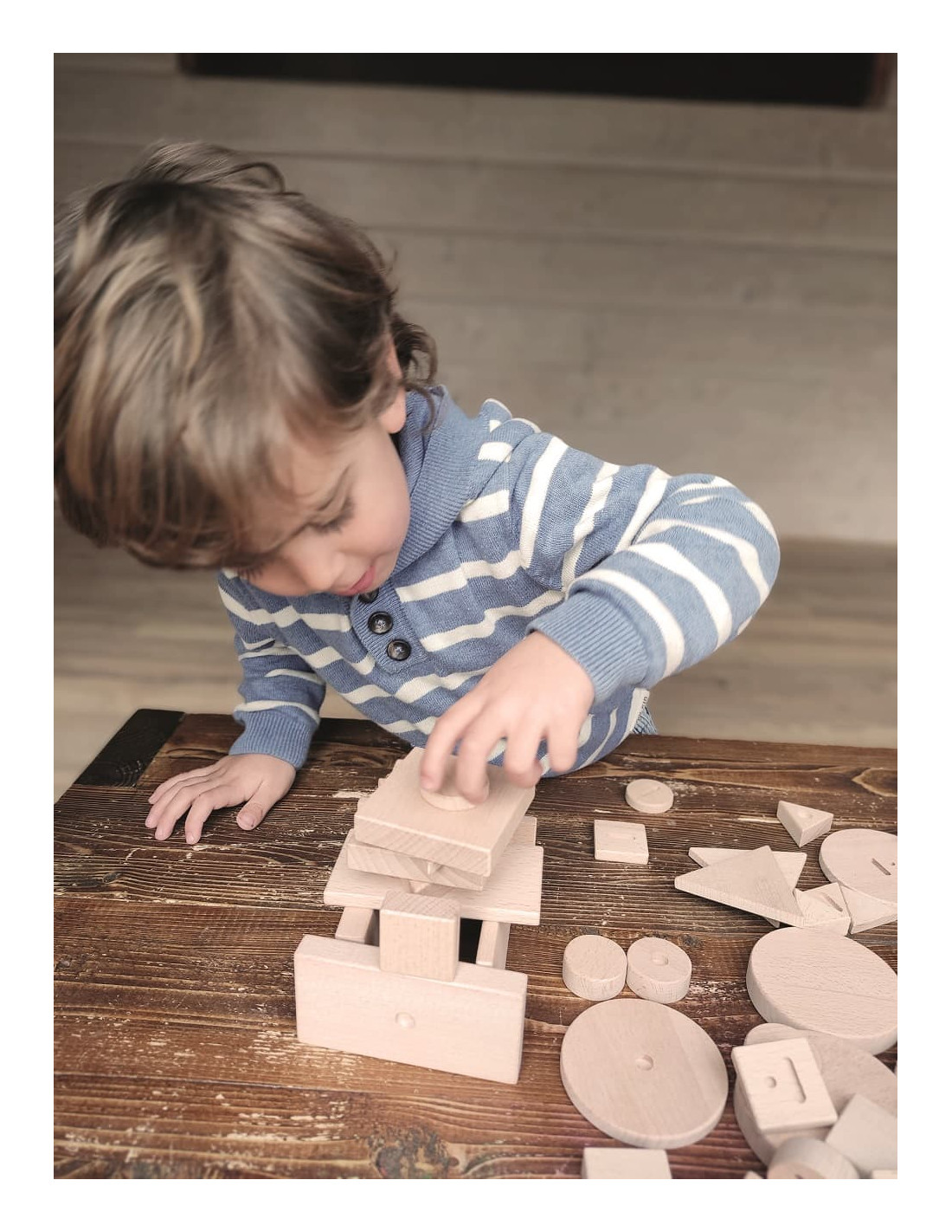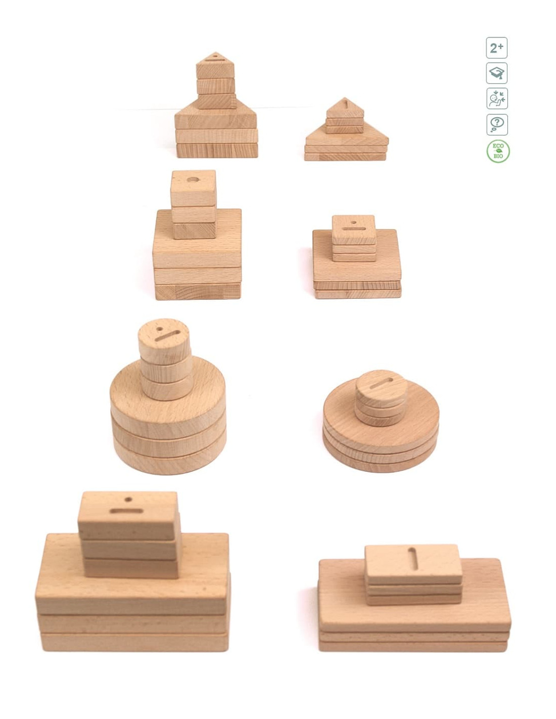 Bloques sensoriales inclusivos, donde los colores son sustituidos por grabados sensoriales en la madera. Trabaja de forma diferente las formas geométricas, los tamaños o los grosores. Fabricado en madera natural ECO. Edad recomendada +2 años.