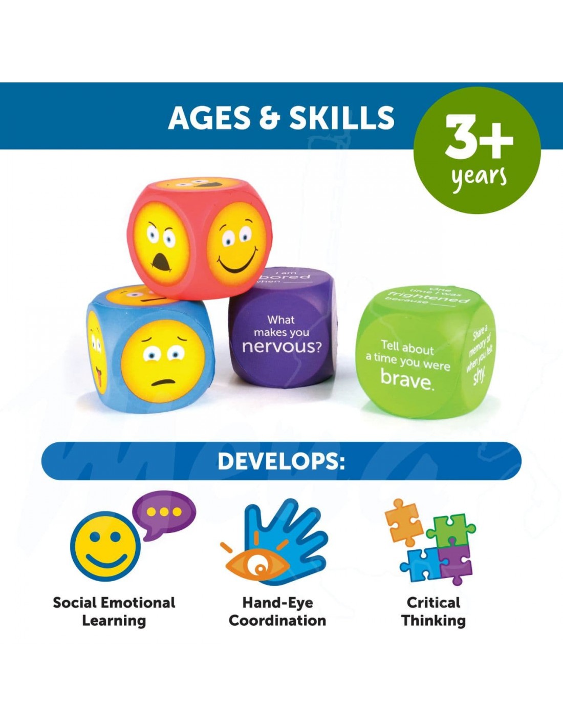 Cada dado muestra diferentes expresiones facilaes, lo que facilita actividades para trabajar la educación emocional, la comunicación y las habilidades sociales.