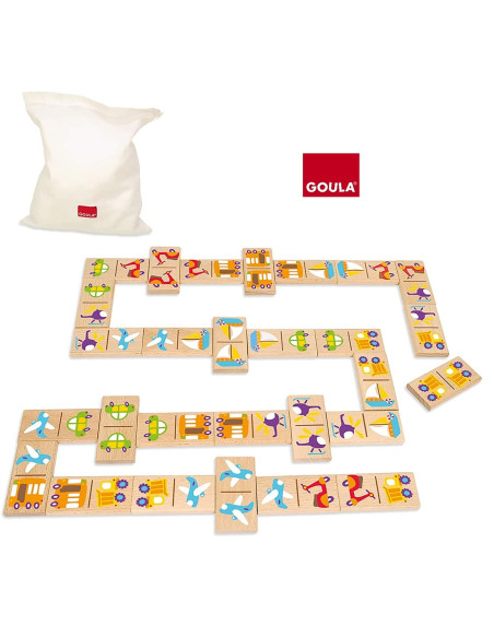 Dominó de imagenes de vehículos que permite observar con detalles las imagenes y asociarlas. Contiene 28 piezas y un bolsa de algodón.